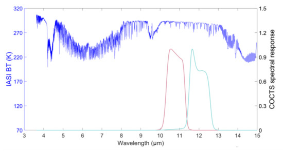 Table 1 shows the instrument characteristics of HY-1C COCTS and IASI. The HY-1C COCTS has eight visible and near-infrared channels, as well as two thermal infrared channels. For the two HY-1C COCTS thermal infrared channels, the dynamic ranges for BT measurements are from 200 to 320 K and the noise-equivalent temperature differences are both 0.20 K around 300 K [12]. The spectral range of IASI is from 3.63 to 15.5 µm, fully covering the two HY-1C COCTS thermal infrared channels. Figure 1 shows a demo of the IASI-measured spectral BTs for 8461 channels with the spectral response functions of the two HY-1C COCTS thermal infrared channels (red: 11 µm channel; green: 12 µm channel). For HY-1C COCTS, there are in total 1656 samples per scan line, with the Earth scanning angle of ±57° from nadir. The spatial resolution of HY-1C COCTS is 1.1 km. For IASI, the Earth scan angle is ±48°20′ from nadir, and there are, in total, 30 scan positions per scan line, each consisting of 2 × 2 instantaneous fields of view (IFOV). The spatial resolution of each IFOV for IASI is around 12 km at nadir. Radiometric calibration of the HY-1C COCTS and IASI is both based on the cold space and internal blackbody measurements [13,19].