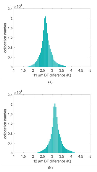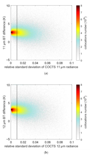 As the point spread functions of COCTS and IASI are different, the filtering of matchups located in the uniform scene is important because it reduces the spatial uncertainties of matchups [10]. Therefore, the homogeneity filtering of matchups is a necessary step. The RSD of the valid HY-1C COCTS pixels on each collocated grid is one effective indicator when quantifying the spatial homogeneity [9]. Figure 3a,b show the variations in HY-1C COCTS minus IASI BTs against the RSDs for the 11 and 12 µm channels, respectively. The background color represents the matchup number in each 0.00025 RSD bin and 0.1 K BT-difference bin. The dispersion degree of BT differences become significant with increasing RSDs. We set both the RSD thresholds for 11 and 12 µm channels as 0.01 to select the matchups located in the uniform scene. In addition, the homogeneity in the wider surroundings is also detected using the RSDs of the surrounding projected grids. If all the RSDs of the collocated grid and its eight surrounding grids are lower than 0.01, this collocated pair is considered to be located in the uniform region. After the homogeneity filtering of the matchups, the total number of the filtered matchups is 197,489. The subsequent assessment of the HY-1C COCTS BT accuracy from the 11 and 12 µm channels is based on these filtered collocations in the following part.