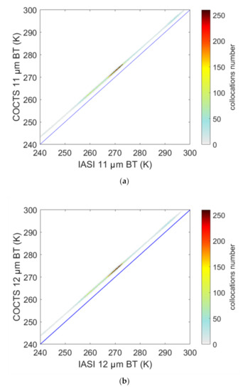The scatter diagrams of the HY-1C COCTS and IASI BTs for the (a) 11 and (b) 12 µm channel. The colored points show the collocated BT values of COCTS and IASI measurements. The blue lines represent the situation where COCTS BTs are equal to IASI BTs.