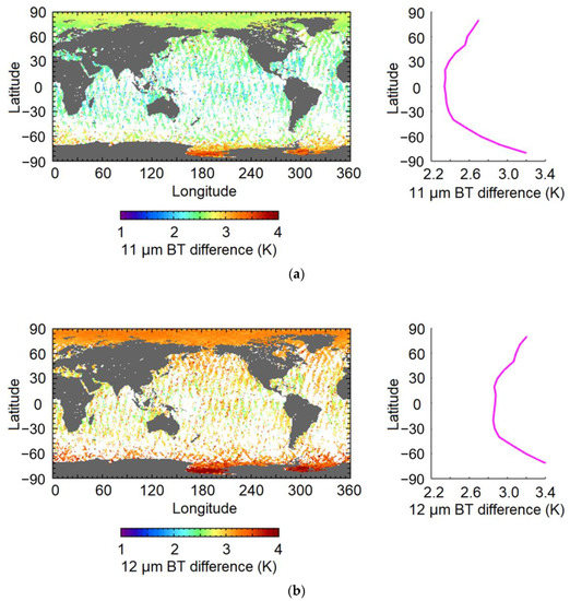 Based on the filtered matchups, the HY-1C COCTS 11 and 12 µm BTs are compared with IASI. Figure 4a,b show the histograms of the HY-1C COCTS minus IASI BT differences for the 11 and 12 µm channels. Figure 5a,b show the scatter diagrams of HY-1C COCTS BT and IASI BT for the 11 and 12 µm channels. The color in Figure 5 indicates the matchup numbers located in every 0.1 K HY-1C COCTS BT and 0.1 K IASI BT bin. The blue lines represent the positions where the HY-1C COCTS BTs equal IASI. It is obvious that the HY-1C COCTS 11 and 12 µm BTs are larger than those of IASI. In addition, the relationships between the HY-1C COCTS BTs and IASI are approximately linear for both channels. The overall statistics of the matchups show that the mean differences of HY-1C COCTS minus IASI for the 11 µm channel is 2.68 K, with a SD of 0.29 K. In addition, the bias of the BT difference between the COCTS 12 µm channel and IASI is 3.18 K, and the SD is 0.28 K. The left panels of Figure 6a,b show the geolocation distributions of the collocations in the global region, and the right panels show the plots of BT differences against latitude. The color in the left panels indicates the COCTS minus IASI BT differences of the collocations. The purple lines in the right panels are the plots of the mean values of the BT differences in 10° latitude bins. The distribution features for the 11 and 12 µm BT differences are similar. The positive BT differences of COCTS minus IASI show the obvious dependence on latitude, with larger values in high-latitude oceans. The span of the BT differences is around 0.8 and 0.6 K for the 11 and 12 µm channel, respectively. In addition, the collocations are densely distributed in the high-latitude region, because of the orbital overlap of COCTS and IASI.