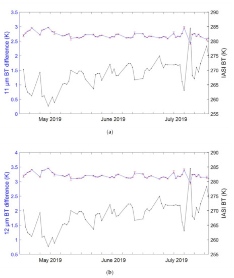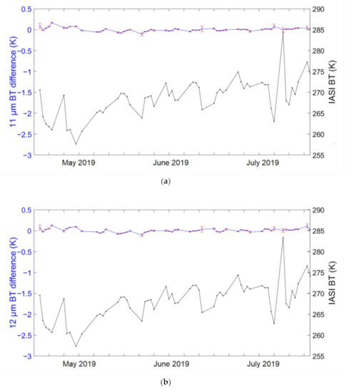 Figure 7a,b show the daily BT differences between COCTS and IASI in the period from 1 May to 31 July 2019. The upper blue lines show the variations in the daily mean differences, accompanied with the red vertical bars indicating the daily uncertainties in the mean (i.e., the SD/√n, n is the daily matchup number). The lower black lines represent the mean values of the IASI daily BTs. Each minor tick on the x-axis represents five days. The missing points indicate that the matchup numbers are smaller than 20 or the HY-1C COCTS data are invalid on these days. For the 11 µm channel, the daily biases change from 2.42 to 2.97 K with a median value of 2.67 K. For the 12 µm channel, the daily biases change from 2.95 to 3.46 K with a median value of 3.17 K. The fluctuation trends of the daily biases for both the 11 and 12 µm channel show the negative correlation with IASI daily BTs. Whether the fluctuations in daily biases are dominated by the time-dependent variation will be analyzed in Section 5.