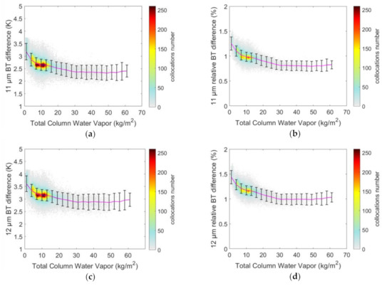 Based on the above comparison results, the dependences of the COCTS minus IASI BT differences on BT and TCWV are analyzed as follows. Figure 8a,c show the variations in the COCTS minus IASI BT differences against IASI BTs for the 11 and 12 µm channels, respectively. The background color indicates the distribution density of matchups, that is, the number of collocations in every minizone of 0.2 K IASI BT by 0.02 K BT difference. The purple curve shows the biases of the BT difference in every 2 K IASI BT bin, with the corresponding black vertical lines representing the SDs in the mean. Figure 8b,d show the variations in the COCTS minus IASI BT relative differences against IASI BTs for the 11 and 12 µm channels, respectively. The relative BT difference is calculated by dividing the IASI BT into the corresponding BT difference. The background color indicates the number of collocations in every minizone of 0.2 K IASI BT by a 0.005% relative BT difference. Both the absolute and relative BT differences of two channels represent an approximately linear dependence on IASI BTs. For the 11 µm channel, the mean value of the absolute BT difference is about 3.24 K when the IASI BT is around 240 K, and then keeps decreasing to 2.31 K when the IASI BT is about 296 K. The mean value of the absolute BT difference of the 12 µm channel has a similar dependence on the IASI BT, from 3.66 to 2.77 K. Overall, the mean values of the 11 and 12 µm BT differences in different IASI BT bins change around 1 K over the matchup range, corresponding to the range of the relative difference change around 5%, and the SDs remain stable around 0.2–0.3 K.