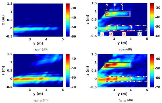 The most striking feature of the 2D span image given in Figure 7c concerns the response of the volume, whose geometrical features are strongly affected by the layover effect. This contribution results into very high reflectivity patterns within regions ① to ③. The significant decrease of intensity of the volume response as ground range increases may be explained by considering both wave scattering physics and 2D imaging geometry. According to the layover effect described above, the volume, whose true position corresponds to incidence angles varying from 42 up to 57, appears at ground range coordinates ranging between 1 m and 3.15 m, i.e., with an incidence angle on the ground ranging from 17 to 44. The consequence of this mislocation is that echoes measured within an angular domain of [−3, 12] in the antenna coordinates, i.e., around 45, are compensated with values computed from the domain [−28, −1], still in the same antenna-centered reference. This misalignment of the measured and compensated domain leads to a strong amplification of the reflectivity in near range and to a pattern that varies rapidly in the range direction. Moreover, the volume being located much closer to the radar in the elevation direction, the resulting strong diversity of incidence angles induces drastic changes of scattering mechanisms as ground range coordinate increases. As explained earlier, it is very likely that the reflection at the air–volume interface reveals itself to be significant, due to the strong dielectric constant between the air and rather dense medium composed of patched wood pellets. It is well known that the intensity of surface reflection can be very sensitive to the incidence angle [27,28], in particular for smooth interfaces. Beyond a given range of incidence angles, the surface reflection becomes negligible and the volume response is then dominated by the diffuse echo of randomly oriented anisotropic wood pellets.