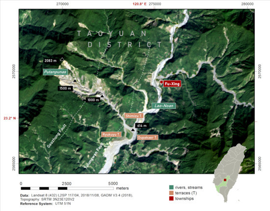The Putanpunas stream is centered at about 23.22N and 120.76E and is located in the northern mountainous region of Kaosiung County. The local relief ranges from approximately 2140 m upstream to 600 m downstream. The stream cuts perpendicularly into the NE–SW oriented mountain ranges and slopes gently towards the SE (see Figure 1). The downstream area at the junction between the Putanpunas stream and the Lao-Noan river which drains towards the SW is characterized by two marginal terrace complexes—the Ryukyu Terrace in the South and the Shimizu Terrace in the North [76,77]. The terraces are cut by the Putanpunas stream, which develops an alluvial fan that extends into Lao-Noan riverbed where it is eroded with material being redeposited during heavy rainfall events.