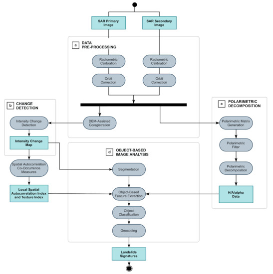 Our aim is to perform a landslide detection using SAR intensity images in the original SAR coordinate system, i.e., slant-range coordinates. The approach we followed in this work established a processing and analysis chain composed of building blocks and data characteristics as outlined above and as detailed in the following paragraphs.