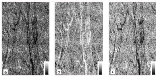Results after polarimetric decomposition; (a) entropy (P, polarimetric), (b) anisotropy, and (c) alpha image.