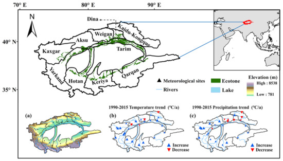 Map of the study area showing the Tarim River Basin and its nine main tributary river basins: the Kaidu-Kongque, Aksu, Weigan, Yarkand, Qarqan, Dina, Hotan, Kaxgar, and Keriya river basins; (a) the elevation of this area ranges from 781 to 8538 m above sea level; the spatial and temporal distribution of (b) temperature and (c) precipitation changes from 1990 to 2015. The black triangles represent the meteorological stations. Blue and red represent the increase and decrease, respectively, and the size of the triangle represents the magnitude of the change.
