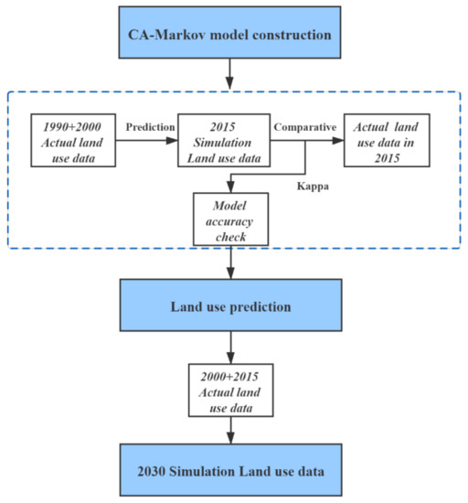 This study applied the CA-Markov model in the Idrisi 17.0 software to land-use data collected in 1990, 2000, and 2015. The first step in the approach used the 2000 data as the starting year and predicted the land use in 2015. The land-use predictions were then compared with the actual land use in 2015 to verify the reliability of the CA-Markov model simulation. Once verified, the spatial patterns in land use in 2030 were predicted using 2015 as the starting year (Figure 2). The images involved in the processing of the Idrisi software are portrayed as raster data, and the land raster size used in this analysis was 30 30 m. The spatial data processing was completed using ArcGIS software.