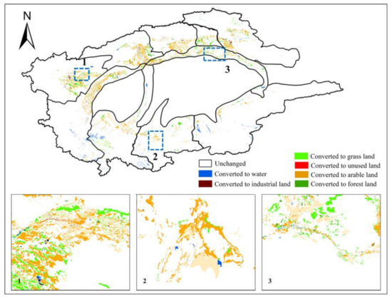 Land-use transfer map of the Tarim River Basin from 1990 to 2015. The lower maps show the local changes in (1) the Weigan River Basin, (2) the Keriya River Basin, and (3) the main stream of the Tarim River.