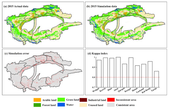 Comparisons of measured (a) and simulated (b) land-use maps of the Tarim River Basin in 2015, along with verification of forecast accuracy; (c) The simulation error between 1990 and 2015; (d) the Kappa index for each river basin.