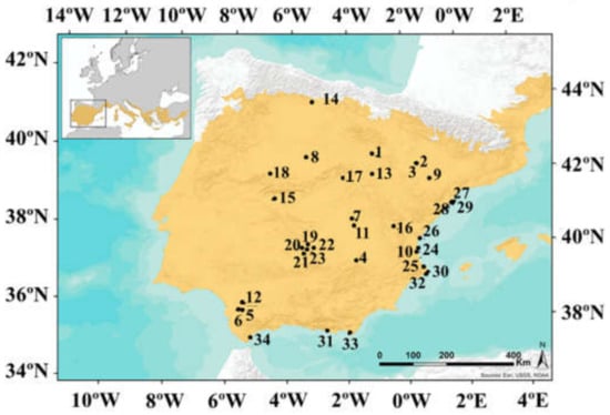 Location of the validation sites over Mediterranean biogeographical region of the Iberian Peninsula: (1) Laguna de Llanos de la Herrada, (2) Galacho de la Alfranca de Pastriz, (3) Galacho de El Burgo de Ebro, (4) Laguna del Arquillo, (5) Laguna Salada de Zorrilla, (6) Laguna de los Tollos, (7) Laguna de El Hito, (8) Laguna de Caballo Alba, (9) Laguna Salada de Chiprana, (10) Ullal de Baldoví, (11) Laguna de los Capellanes, (12) Laguna de Alcaparrosa,(13) Laguna de Judes, (14) Laguna de Campillo, (15) Laguna de Palancoso, (16) Laguna de Talayuelas, (17) Laguna Grande de la Puebla de Beleña, (18) Charca del Monte, (19) Laguna de Fuentillejo o La Posadilla, (20) Laguna de La Carrizosa, (21) Laguna de Almodóvar, (22) Laguna Blanca de Armagasilla, (23) Laguna de Caracuel, (24) Mallada de la Mata del Fang (l’Albufera), (25) Marjal de Pego-Oliva, (26) Marjal dels Moros, (27) Filtre Biologic l’Embut, (28) L’Encanyissada, (29) Alfacs marshes, (30) Senillar de Moraira, (31) Albufera Nueva de Adra, (32) Salinas de Calp, (33) Salinas de Cabo de Gata, and (34) Palmones marshes. Brown area indicates the Mediterranean biogeographical region of the Iberian Peninsula.