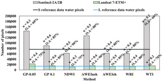 Accumulated number of water pixels estimated by the different methods tested, for the entire dataset using Sentinel-2A/2B (S) and Landsat-7 ETM+ (L) imagery. Black and blue lines indicate the water pixel number of the reference data at the 10 m (S) and 30 m (L) spatial resolution, respectively. k refers to the kappa coefficient value and O.A to the overall accuracy value.