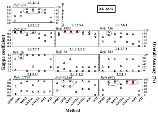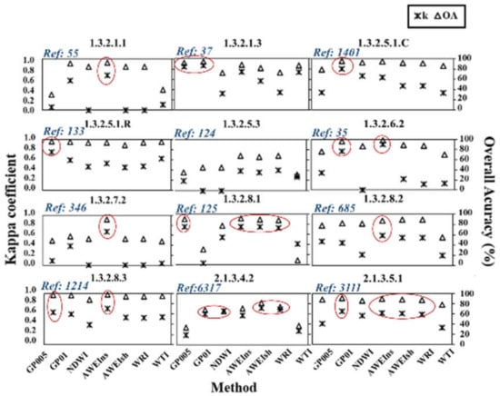 Kappa coefficient (crosses) and overall relative accuracy (triangles) for the different methods tested and the different lake/wetland types as listed in Table 1, for the Landsat-7 imagery. In blue is indicated the number of reference water pixels and the best results for each type are marked in red.
