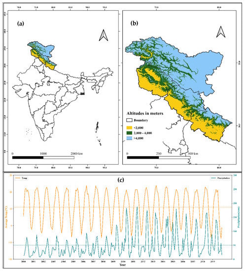 (a) The northwest Himalaya (NWH) region marked on the map of India, (b) elevation zones of the study area (NWH), and (c) the overall (240 months) temperature and precipitation profile over the NWH region, where horizontal dashed lines represent their mean values in their respective colors.