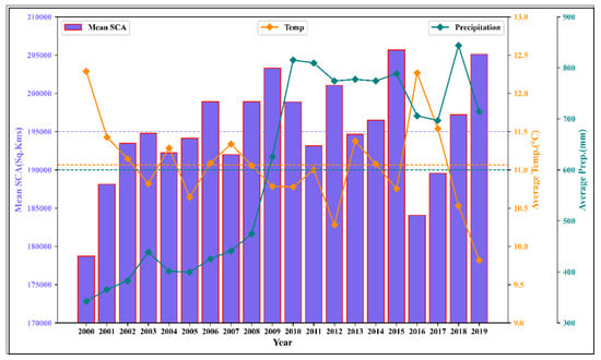 Mean annual snow cover area (SCA) (maximum extent), temperature, and precipitation over the NWH during 2000–2019. The horizontal dashed lines represent their mean values in their respective colors.