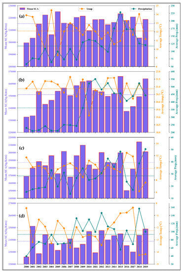 SCA trend analyses at different scales were carried out for the period 2000–2019. The mMK-test shows a statistically significant increasing trend in annual SCA, with a rate of 663.88 km2/year (Table 1).