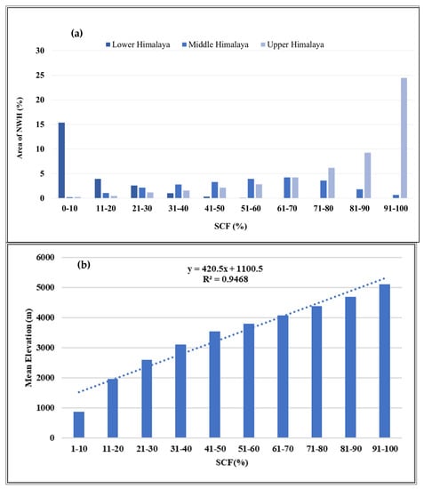 (a) Overall (240 months) NWH area (%) for the lower Himalaya (LH), middle Himalaya (MH), and upper Himalaya (UH) at different SCFs (%). (b) Mean elevation (m) of the overall 240 months at different SCFs (%).