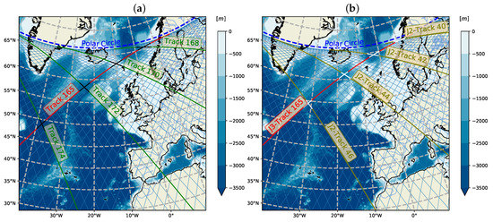Figure 1a shows standard tracks of the Jason’s missions in the North Atlantic. The ascending track N165 is given in red as a reference one. The self-crossover (SC) of the orbit occurs at descending track N168 (plus 3 to the ascending track number) near the limiting latitude in a time lag a bit longer that one orbit period (≈112 min). In one more orbit period (plus 5 to the reference track N165), a similar SC occurs at lower latitude. The new crossovers with the fixed ascending track (N165 in our case) continues to appear with every new orbit, thus travelling to the South Pole. The passage of crossovers between poles takes approximately 1 day (about 12 orbit periods) for the fixed reference track (track N165 in our case of Figure 1).