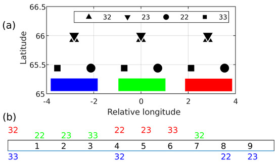 Crossover clusters with minimal time lags. (a) Relative location of three clusters. Symbols and codes of SCs and ICs are given in legend. Longitude is shown relative to the IC of green cluster (see column 3 of Table 2). (b) Timeline of crossovers in days of cycle (black numbers 1–9) relatively to IC 32 of the central cluster. The color code corresponds to the cluster colors in (a).