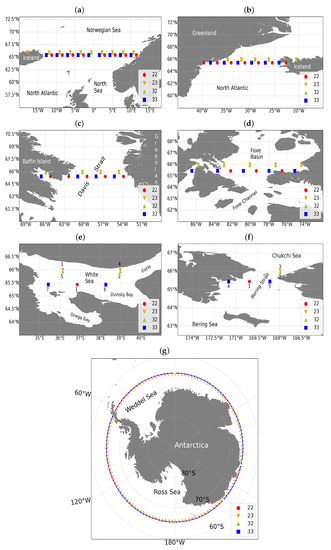 SCs and ICs of the phase of interleaved orbits of Jason-2/3: (a) the Norwegian Sea; (b) the Denmark Strait; (c) the Davis Strait; (d) the Foxe Basin; (e) the White Sea; (f) the Bering Strait; and (g) the Southern Ocean.