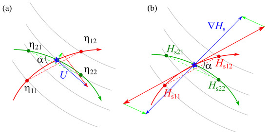 Setups of altimetry measurements in a crossover point. (a) Measurements of large-scale currents by satellite altimeter. Along-track differences of the sea surface height anomaly and are used to get transversal projection of the current velocity. (b) Measurements of wave steepness. Along-track differences of the significant wave height and are used to estimate along-track components of with “back–forth” ambiguity. Two possible configurations are shown by solid and dash-dotted vectors.