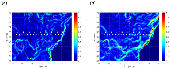 Geostrophic currents in the Norwegian Sea from the GLORYS12V1 reanalysis. Absolute value of current velocity in m/s for: 17 October (a); and 27 October (b). White circles show crossover sites (for details, see Figure 3a).