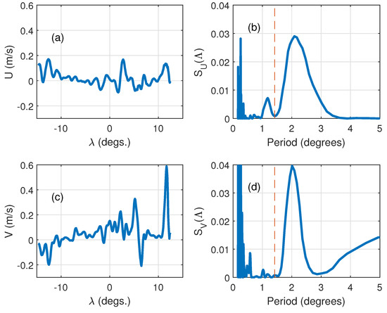 The GLORYS12V1 product has been used for assessment of large-scale currents. The data are provided at a standard regular grid at (approximatively 8 km) resolution. This eddy resolving reanalysis is based on altimetry data since 1993. We choose the period 17–27 October 2016 covering the whole cycle of Jasons’ altimeters. The absolute values of the current velocity are shown in Figure 5a,b for the first and last (27 October) days of the period under study. The figures reflect the complicated structure of jets in this area described in Section 3.1. At the same time, the fine structure of the currents that visually correlates with directions and locations of Jasons’ tracks look somewhat suspicious. This distrust is confirmed by trivial spectral analysis.
