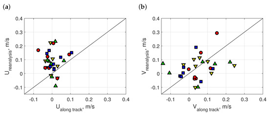Figure 4a provides the well-known scheme of altimetry measurements of currents in a crossover point. Non-parallel tracks (red is ascending as in our previous figures and green is descending) allow the components of the geostrophic current, which are perpendicular to track directions (dashed lines in Figure 4), to be estimated. The linearity of Equation (1) eases estimate of both wind values and associated errors. Local differences in current velocity can be used to estimate changes in water transport. Anomalies of current velocity, derived from the Sea Level Anomaly, can be used for calculation of anomalies of water transport, or they can be transformed into absolute current velocity (and then to absolute water transport) by adding the Mean Dynamic Topography derived from the difference between the mean sea surface and the geoid or from ocean drifters and hydrographic profiles.