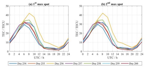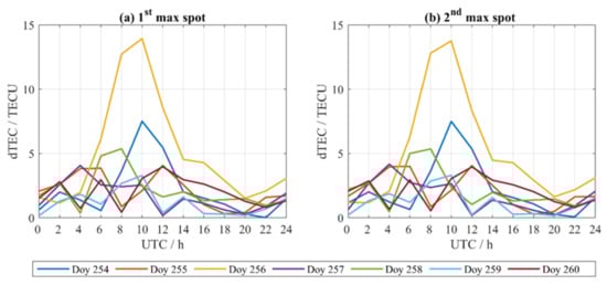 Vertical Total Electron Content (VTEC) time series over (a) 1st and (b) 2nd maximum spots of the Super Typhoon Mangkhut, respectively, from 11–17 September 2018 (DOY 254–DOY 260).