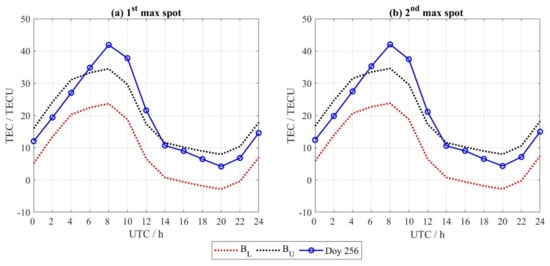 VTECs lower (BL) and upper (BU) bounds of the interquartile range method (IQR) method versus the VTEC time series of DOY 256. The data represented over (a) 1st and (b) 2nd maximum spots of the Super Typhoon Mangkhut from DOY 244 to DOY 253.