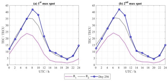 Figure 5 shows the results of by RTD method, where the VTEC time series of DOY 256 versus the lowest and highest range limits values overall in the ten days before the super typhoon. As it is known, the range of a data set is considered as a substantial measurement, where the figures at the bottom and top of it stand for the findings furthest removed from the majority. The lowest and highest range limits in ten days indicate the maximum and minimum of VTEC sequences during the normal behavior before the typhoon. As seen in Figure 5, the VTEC time series range of the ten days before the typhoon is clustered around the minimum and maximum. The VTEC time series in DOY 256 has exceeded the highest range limit during the specific period and arrives at the maximum value around 08:00 UT; then, VTEC data go to degradation, the disturbance almost ended around 14:00 UT, and the differences after 14:00 UT are not significant. So, it could be considered as VTEC ionospheric disturbance when its values override the highest range limit from 6–14 UT. During the ionospheric anomalous deviations from about 6–14 UT, the maximum difference between DOY 256 VTEC values and highest (R2) range limit were 8.25 TECU and 7.95 TECU over the (a) 1st and (b) 2nd maximum spots of the typhoon, respectively. Logically, the results over the two maximum spots are convergent where the two points of maximum sustained wind speed away with only ~100 km.