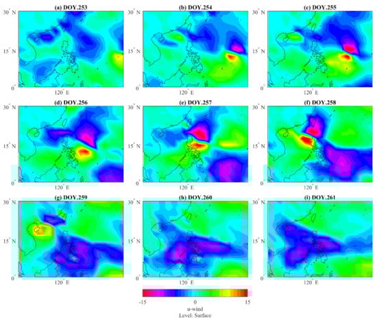 The anomaly maps of zonal wind from 10–18 September 2018; the panels (a–i) corresponds to DOY 253–DOY 261, respectively.