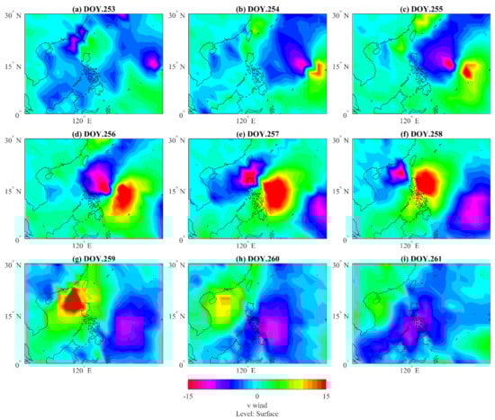 Figure 7 shows that the behavior of the typhoon in the zonal flow’s direction tends to be weaker and has fast-moving which causes a relatively slight impact on the local weather. Meanwhile, Figure 8 shows the meridional flows tend to be stronger with slow-moving. This pattern is accountable for most instances of severe weather during the typhoon. This kind of extreme weather during flow regime is not only marked with strong storms but also the temperatures can reach their extremes, these weather disturbances can produce cold waves and heat waves depending on the poleward or equator-ward direction of the flow [59,60]. By returning to Figure 8a–c, we can see the meridional wind has slight variations from DOY 253–DOY 255. Then, a critical change has happened from DOY 255 (panel c) to DOY 256 (panel d), and this variation indicates a sudden increase in the meridional wind between the aforementioned DOYs. It is worth indicating that the critical change of meridional wind happened on the same day of maximum ionospheric variations DOY 256. This may be a possible reason that the meridional winds and their resulting waves may contribute to upper atmospheric coupling.