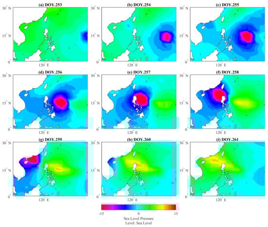 The anomaly maps of sea-level pressure on 10–18 September 2018; the panels (a–i) corresponds to DOY 253–DOY 261, respectively.