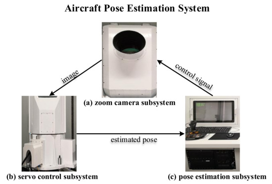 As shown in Figure 1, we conduct a system to estimate the aircraft pose in real-time during take-off and landing of the aircraft. This system consists of three parts: the zoom camera subsystem, the pose estimation subsystem, and the servo control subsystem. The zoom camera system captures the 2D image of the aircraft. Then the pose estimation subsystem estimates the 6D pose parameter based on the captured image. Next, the servo control subsystem controls the zoom camera subsystem to capture the next 2D image. The figure of this system is shown in Figure 2. In this article, we focus on the pose estimation subsystem and propose a new algorithm to estimate the aircraft pose quickly, accurately, and robustly.