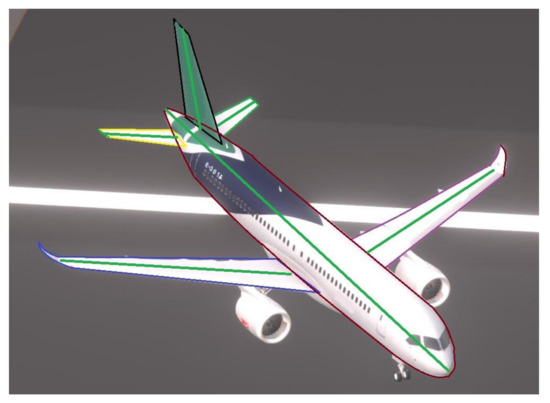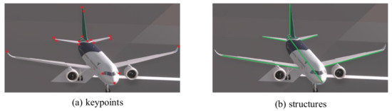 The second intermediate representations consist of structures. Reference [46] defines the lines that represent the fuselage and the wings as the structures of the straight-wing UAV which are simple and effective. However, we cannot estimate the pose parameters just by them because cannot be calculated. HybridPose [30] uses edge vectors to capture correlations between keypoints and reveal the underlying structure of the object. However, the edge vectors are defined between the adjacent keypoints which means edge vectors and keypoints are not independent of each other. As shown in Figure 7, the aircraft is mainly composed of six parts which are the fuselage, the left and right wings, the left, and right horizontal tails, and the vertical tail. Based on the idea that each structure corresponds to a part, we select six line segments to represent the topological structure of the aircraft. The defined structures are shown in Figure 6.