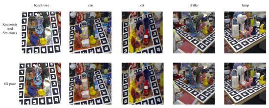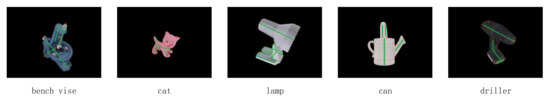 The LineMOD dataset [50] is one of the standard datasets for 6D pose estimation. It consists of 13 sequences, which contain ground-truth poses for a single object of interest in a cluttered environment and the accurate CAD models. The ground-truth keypoints and structures can be obtained through reprojection according to the annotated poses and the CAD models. Different from other literature, we selected just five sequences to evaluate our algorithm which are cat, lamp, bench vise, cam, and driller. For other objects, their structures are not obvious and our algorithm is not suitable for them. On this dataset, we randomly select 80% of examples for training, 20 instances for validation, and the rest for testing.