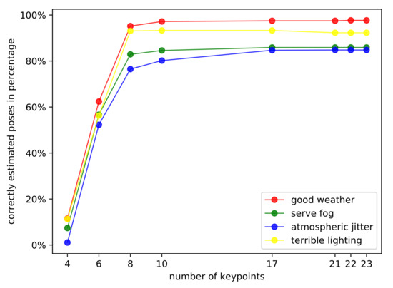 Then we conduct a quantitative experiment to show the relationship between the pose estimation accuracy and the number of keypoints. As shown in Figure 17, it is obvious that with the increase of the keypoints’ number the accuracy of pose estimation improves. However, when the number increase from 17 to 23, the accuracy barely improved which indicates that these 17 keypoints have fully represented the aircraft geometry. The reason why we only choose 23 keypoints at most is that it is hard to select other points on the aircraft surface which have as much rich geometric information as these points. If we select some points with rich texture information, the algorithm may fail when over exposure as we discussed in Section 3. These selected 23 points are the apex of the aircraft nose, the leftmost and the rightmost points of the flight compartment windows, the vertexes of the two wings, the vertexes of two horizontal tails, the vertexes of the vertical tail, the backmost vertex of the tail, and the center of the aircraft. What is more, it is impossible to select a continuous number of keypoints because of the aircraft geometry. For example, it is hard to add a point to the keypoints on the basis of ‘SH-9Kp’ because of the symmetry of the aircraft.