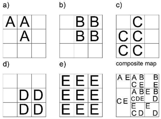 Gray’s conceptual model for making a composite map [27]. Figures (a–e) demonstrate “atom fields in concept” [27] p. 146.