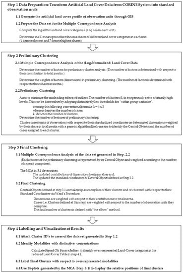 Research in urban theory recently reformulated the holistic “planetary urbanization” approach [26] to comprehend territorial urbanization beyond an urban/rural division. This literature, however, avoids systemic non-theoretical descriptions. To assess “complex entities” such as regions in geography, Gray [27] stresses the crucial need to create concepts via categorization. In Gray’s method, exploratory analysis and composite maps are imperative for categorization. According to Gray, these composite maps should convey the complexity of spatial data (such as land cover) beyond homogenous concepts, however, he does not define an analytical procedure to generate such maps. Recent progress in data analysis has facilitated data categorization. Lebart’s [28] method on “complementary use of correspondence and cluster analyses” is an exploratory (unsupervised) data analysis technique that can be used for data categorization. The complementary use proposed by Lebart minimizes the methodological problems of both correspondence analysis and cluster analysis, and thus enables the generation of composite land cover maps based on data categorization.