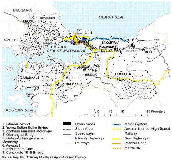 The study area of the Marmara Region and associated mega-projects.