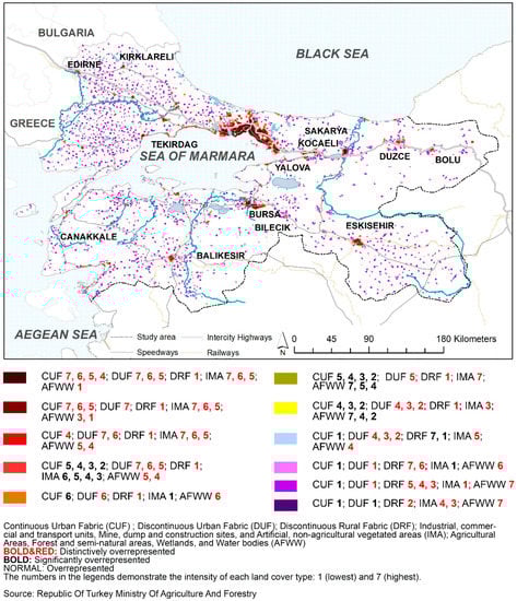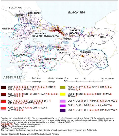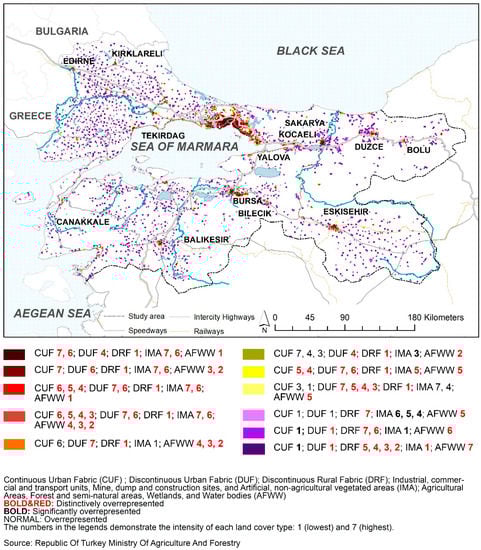 Land cover categories in which CUF, DUF, and IMA are distinctively over-represented increased in the provincial centers of Tekirdag, Kirklareli, Edirne, Sakarya, Bursa, Eskisehir, Canakkale, and Balikesir, as was also the case in district centers in Thrace and southwestern Marmara (namely Luleburgaz, Babeski, Corlu, Cerkezkoy, Marmaraereglisi, Kesan, Bandirma, Biga, Can, Edremit, Karacabey, and Mustafakemalpasa) and around the Gulf of Izmit. Due to this transformation that was mainly observed along the major highways, there were significant changes, crystallized in the disrupted rural structure in Thrace (Figure 9) and the southwestern Marmara Region as distinctive urban nodes. Interestingly, this change was noticed by the policymakers. Therefore, Thrace, Luleburgaz, Corlu, and Cerkezkoy were designated as an industrial axis and primary development area in the 2014–2023 Thrace plan [79].