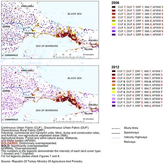To answer these questions this study generates composite maps of the Marmara Region based on CLC data for 2006, 2012, and 2018, by utilizing Gray’s [27] exploratory approach and Lebart’s data analysis model [28]. These composite maps demonstrate the coexistence and intensity of different urban land cover types, and reveal the complex regional urbanization patterns, providing the much-need spatial framework ignored by the contemporary regional policies and planning interventions. Hence such maps can be utilized as guidelines for sustainable regional policy and planning frameworks. The findings of this study contribute to the theoretical, empirical, and methodological discussions about urban regions by revealing the idiosyncratic patterns and sustainability challenges of one of the world’s fastest-evolving examples.