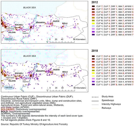 Urban fabric land cover comparison of the eastern Marmara axis for 2012 and 2018.