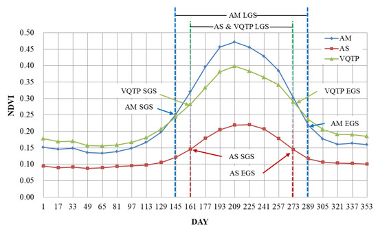 - Due to different vegetation types and regional differences in temperature and precipitation, the SGS, EGS and LGS of the AM, AS and VQTP were different. The SGS of the AS and VQTP were approximately half a month later than that of the AM, while the EGS were approximately half a month earlier than that of the AM. Their LGS values were clearly shorter than that of AM.