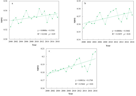 Interannual variation characteristics of the growing season NDVI from 2000 to 2018: (a) VQTP, (b) AM, and (c) AS.