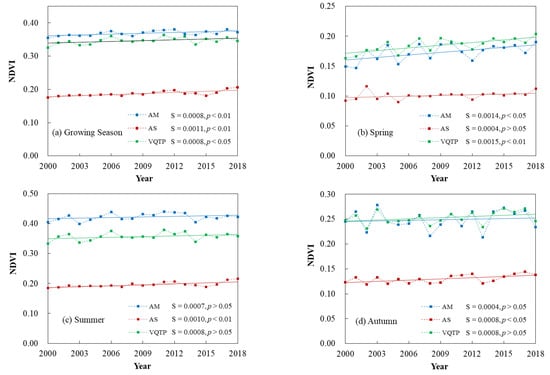 - From 2000 to 2018, the NDVI of the AM, AS and VQTP all showed upward trends in each season. The NDVI of the AM and VQTP increased at the fastest rate in the spring, while the NDVI of the AS increased at the fastest rate during the growing season. The peak growth periods of the AM, AS and VQTP were all in the summer. The fluctuation trends of the NDVI for the AM, AS and VQTP were relatively consistent during different seasons, indicating that the AM and AS played key and decisive roles in the overall vegetation change trend on the Qinghai-Tibet Plateau.