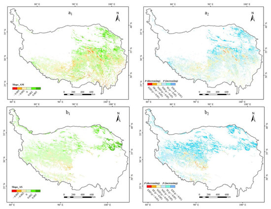 Using the AM and AS vector boundaries to extract the spatial and temporal variation trends of the growing season NDVI and its test results for the QTP, the spatial distribution of the variation trends and significance test results for the AM and AS were obtained, respectively (Figure 7). The results showed that the increasing region of the AM was mainly distributed over the central and eastern parts of the QTP, and its area accounted for 29.25% of the vegetation increase in the monitored area, of which the region with a significant increase (p < 0.05) accounted for 22.63% (Figure 7a1 and a2, Table 3). In addition to the mountainous region in the southeastern QTP, the vegetation degradation trend in the AM distribution region was clear. The region with a decreasing trend in the AM accounted for 51.49% of the vegetation degradation in the monitored area, of which the significantly decreased area (p < 0.05) accounted for 39.78% of the monitored area with a significant decrease (p < 0.05), which was mainly distributed within the source region of the Yangtze River, northwest of Lhasa and along National Highway 109 (within Lhasa) (Figure 7a1 and a2, Table 3). The above analysis showed that more than half of the vegetation degradation on the QTP occurred in the AM, and the significant degradation region accounted for a higher proportion of the significant degradation in the monitored area.