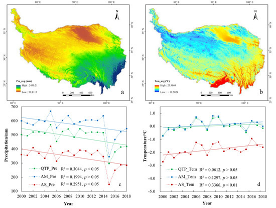 The average value of the meteorological interpolation data was calculated in the study area from 2000 to 2018, and the spatial distribution of the annual precipitation and annual mean temperature was obtained for the past 19 years (Figure 8a,b). As shown in Figure 8a, the average multiyear precipitation on the QTP showed an obvious step-like distribution, gradually decreasing from the southeast to northwest, with a range of 50.81~2450.21 mm, which represented a large span. The regions with high precipitation were primarily concentrated in the western Sichuan Plateau and the northwest mountainous Yunnan Province, and the average annual precipitation was over 1500 mm. The regions with low precipitation were largely distributed in the Qaidam Basin and the central and western parts of the Ali region of Tibet. The average annual precipitation was below 300 mm. As shown in Figure 8b, the spatial distribution range of multi-year mean temperature is from −19.50 °C to 23.99 °C. Except for the higher temperature in the Qaidam Basin, the distribution of the regional average annual temperatures was similar to that of the precipitation, which gradually decreased from the southeast to northwest as the altitude increased. Due to the effect of the altitude and terrain, the regions with high temperatures were mainly distributed in the southern and southeastern valleys of Tibet at lower altitudes. The regions with low temperatures were mostly distributed in the Kunlun Mountains and the Qiangtang Plateau region. The average altitude of this region was above 4000 m, and it was the main distribution area of AS and alpine desert.