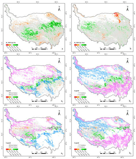 The correlation and spatial distribution of the significance level between the growing season NDVI and annual precipitation, annual mean temperature: (a) VQTP_NDVI and precipitation, (a1) AM_NDVI and precipitation, (a2) AS_NDVI and precipitation, (b) VQTP_NDVI and temperature, (b1) AM_NDVI and temperature, (b2) AS_NDVI and temperature.